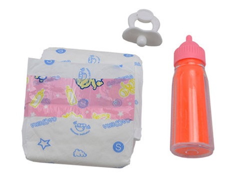В наборе 3 аксессуара - памперс, бутылочка и пустышка.