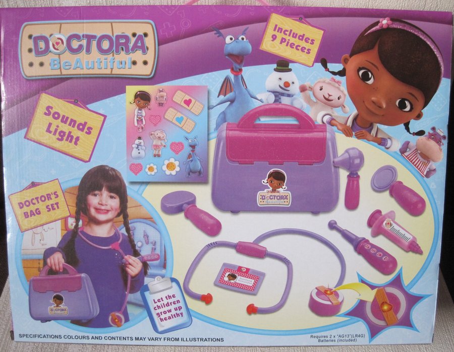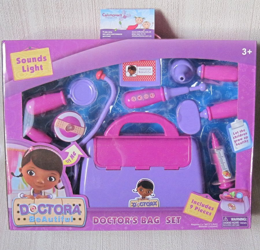 У набір входять входять 9 предметів - чемоданчик, стетоскоп (зі звуковими і світловими ефектами), молоточок, шприц, бейдж і багато іншого.