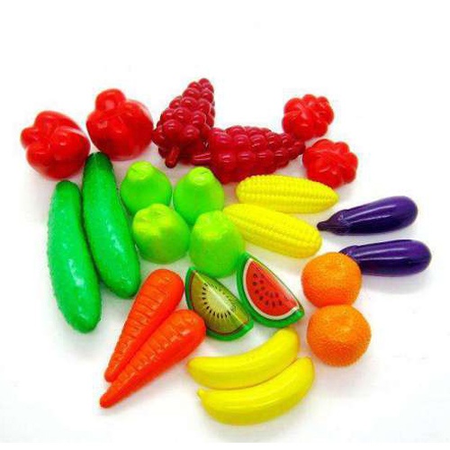 У наборі 24 різних овочів і фруктів - морква, баклажан, виноград, банан, ківі, кукурудза, болгарський перець, яблуко та ін.