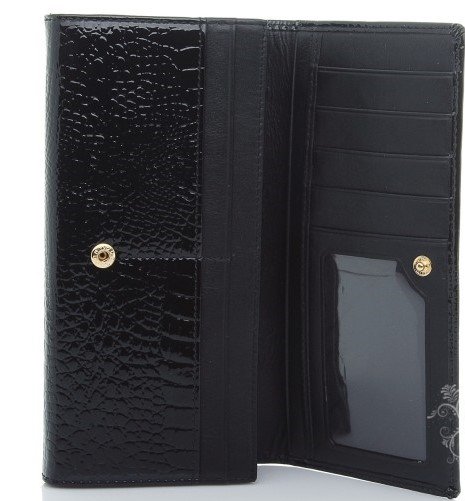 Всередині: три основних відділення, бічне відділення на блискавці, 8 відділень для кредитних карт і один відділ для пропуску. Ззаду гаманця відділення на клямці.